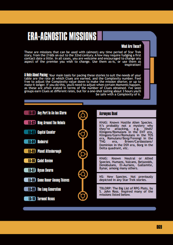 This game is for Star Trek fans new and old. I do suggest that the GM of the game be someone who is familiar with Star Trek stories from the various TV series and movies, to enable them to provide context as elements from the canon are referenced, to help them improvise characters and other scene elements, and to ensure that the stories told at the table feel as much like Star Trek as the group wishes them to.